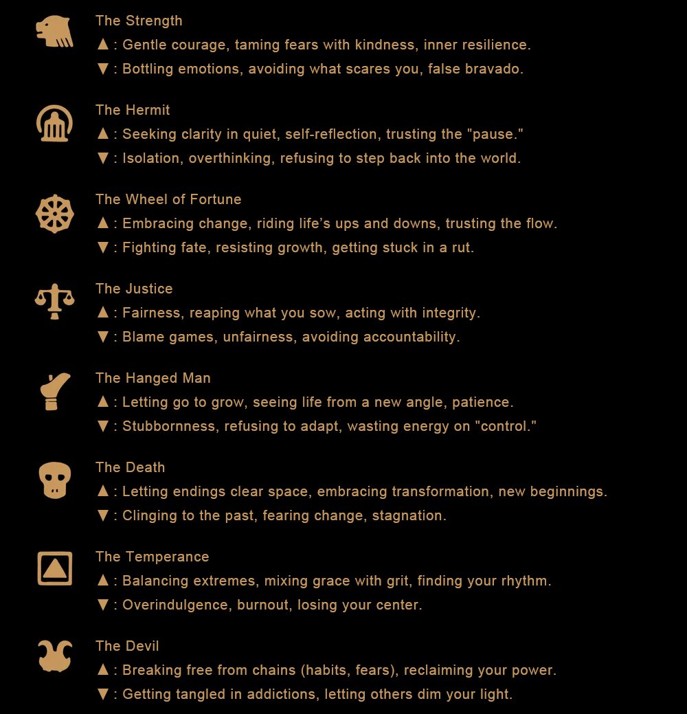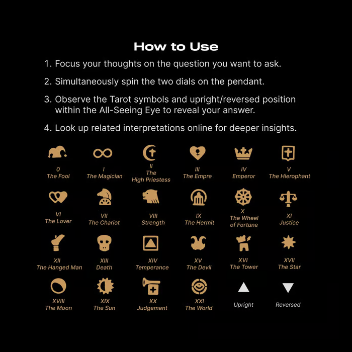 22 Major Arcana symbols adorn the outer ring; the brass center mirrors upright/reversed energies. Your Tarot deck, condensed—wisdom at a glance, always within reach. 💫