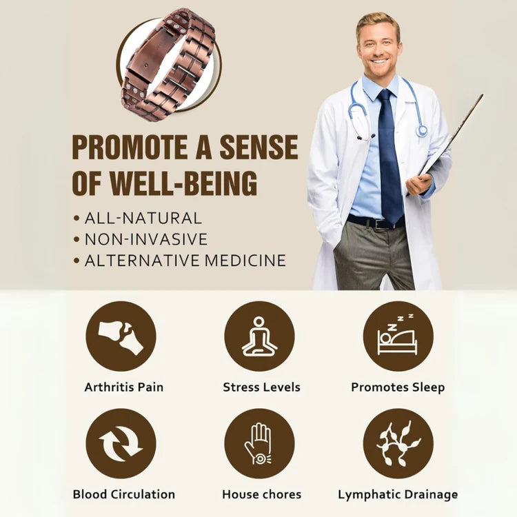 Most doctors won’t tell you this: persistent pain in your hands and wrists isn’t just caused by overuse. It’s bio-magnetic tension — a hidden issue created by constant typing, gripping tools, and handling electronic devices, which generates chronic tension that restricts blood flow to thousands of tiny capillaries in your wrists. Over time, your wrists become a “bottleneck,” depriving your hands of adequate blood flow and energy. This is why creams and pills fail — they only treat symptoms, not the root cause. The Ultra Strength Magnetic Copper Bracelet, with its Tri-Magnetic Conduction Flow system, is designed to target this tension directly. Pure copper conducts a powerful triple magnetic field deep into your wrist, helping reopen blocked pathways for lasting relief. All-day comfort that actuallyimproves over time Forget heavy, uncomfortable bracelets that leave marks on your wrist. At just 104 grams, this bracelet feels substantial enough to know it's working but light enough to forget you're wearing it.The breathable design prevents moisture build up, even during workouts. And here's the key: Unlike temporary solutions that fade quickly, the benefits intensify the longer you wear it. Your body's natural energy flow improves over time.